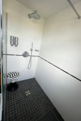Une chambre spacieuse avec accès direct à un dressing aménagé et à une salle d’eau contemporaine avec douche à l’italienne,