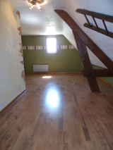 La maison s'étend sur deux niveaux avec un vaste couloir - trois chambres dont une avec balcon - une salle de jeux d'environ 50 m² - une salle de bains - des toilettes - un accès grenier