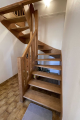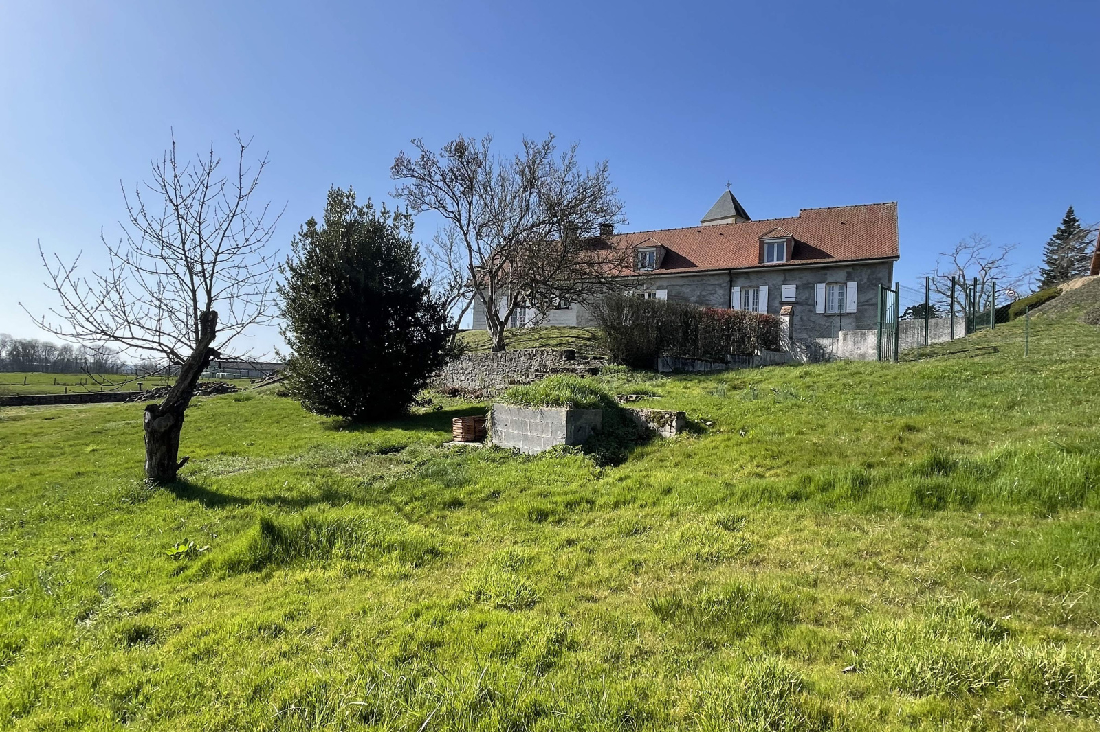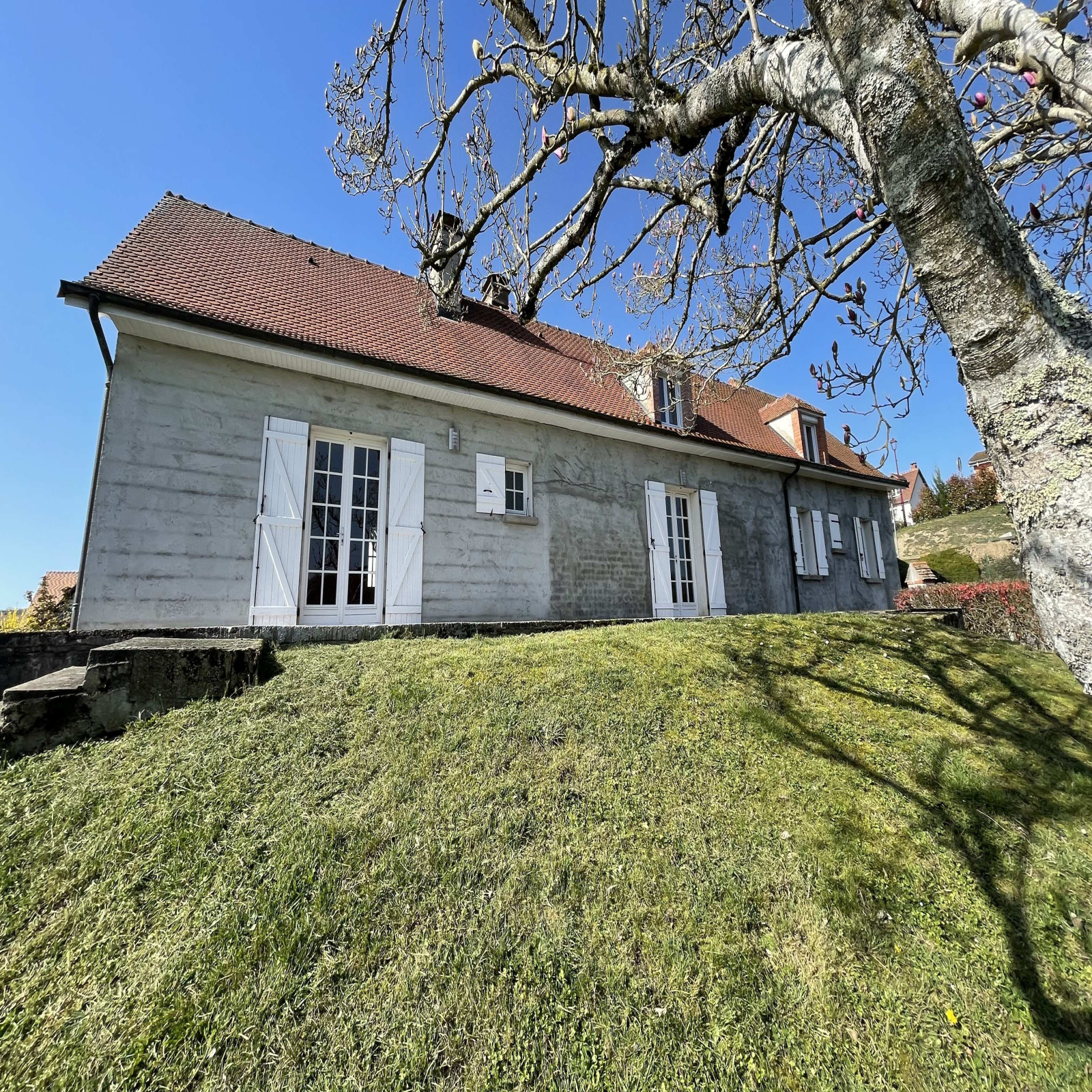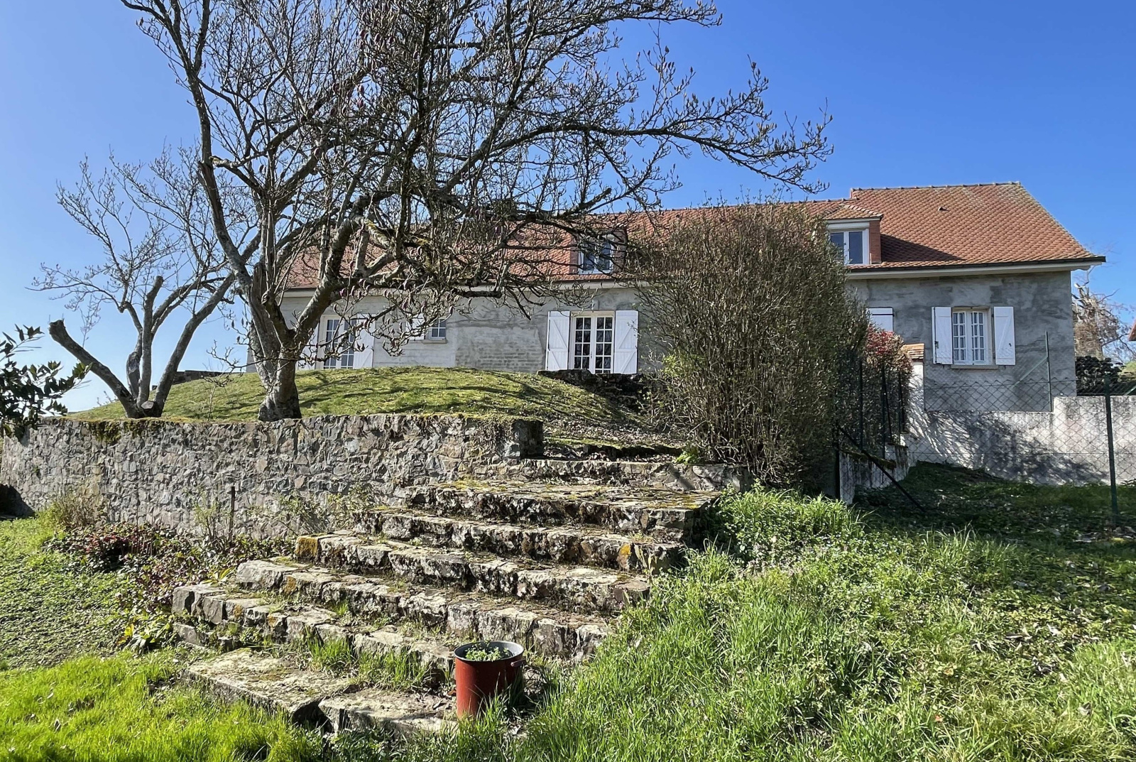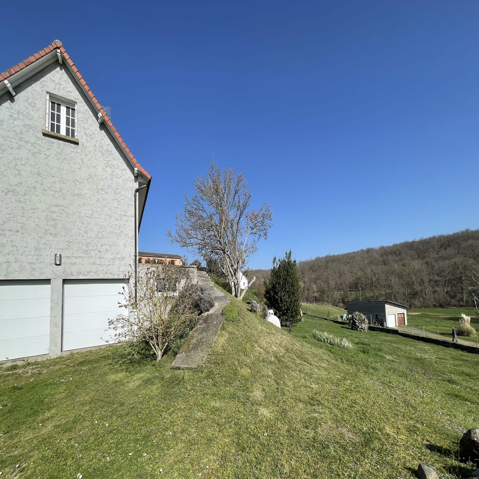 L’habitation et sa terrasse en prolongement surplombe le terrain arboré de 1822m² accessible par un escalier de pierre.