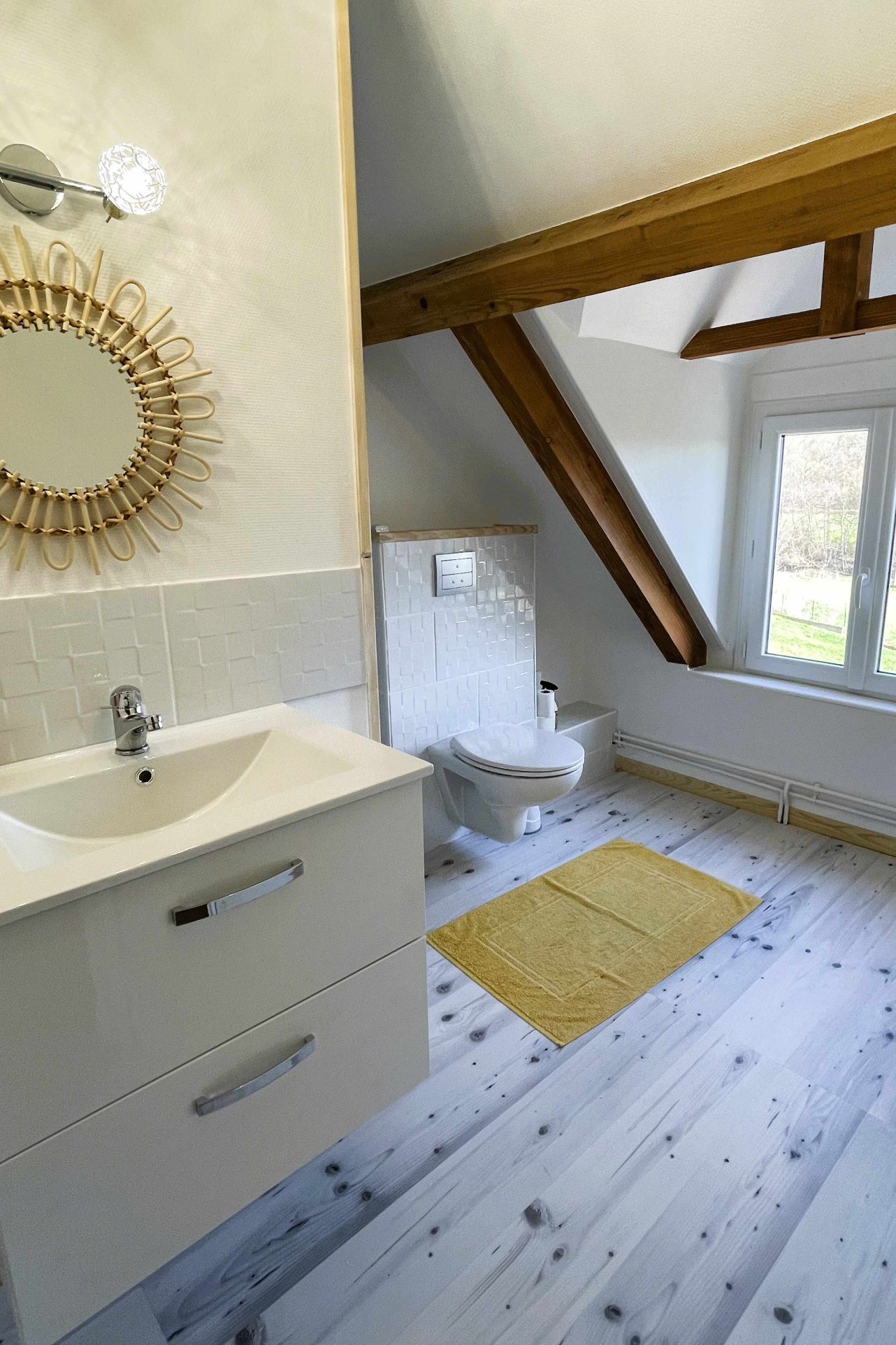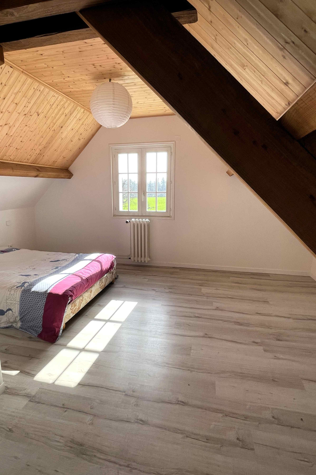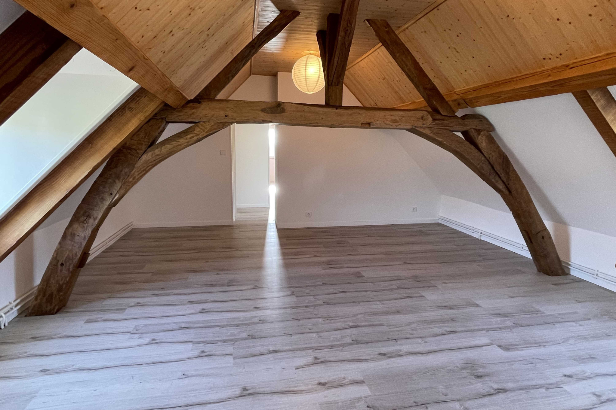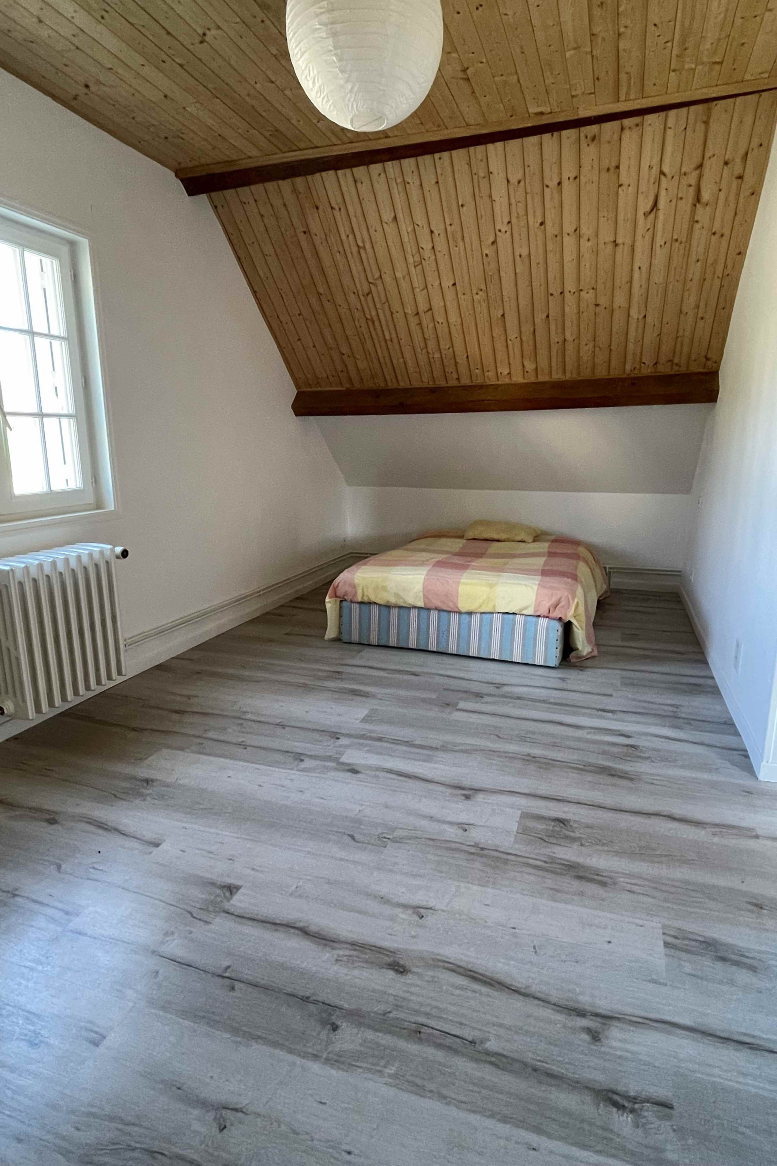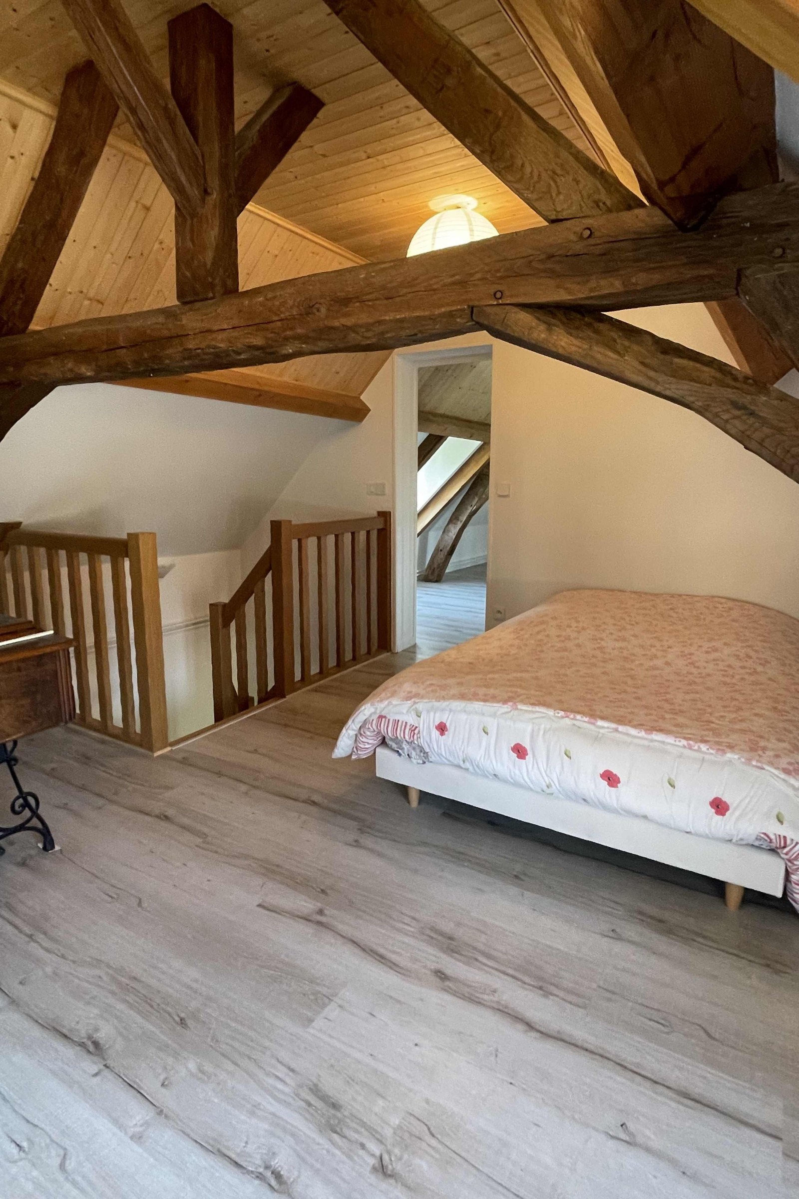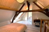 A l’étage, les combles aménagés sous la belle charpente apparente offrent un grand espace lumineux et chaleureux avec une mezzanine, 3 chambres et une salle d’eau + wc.
