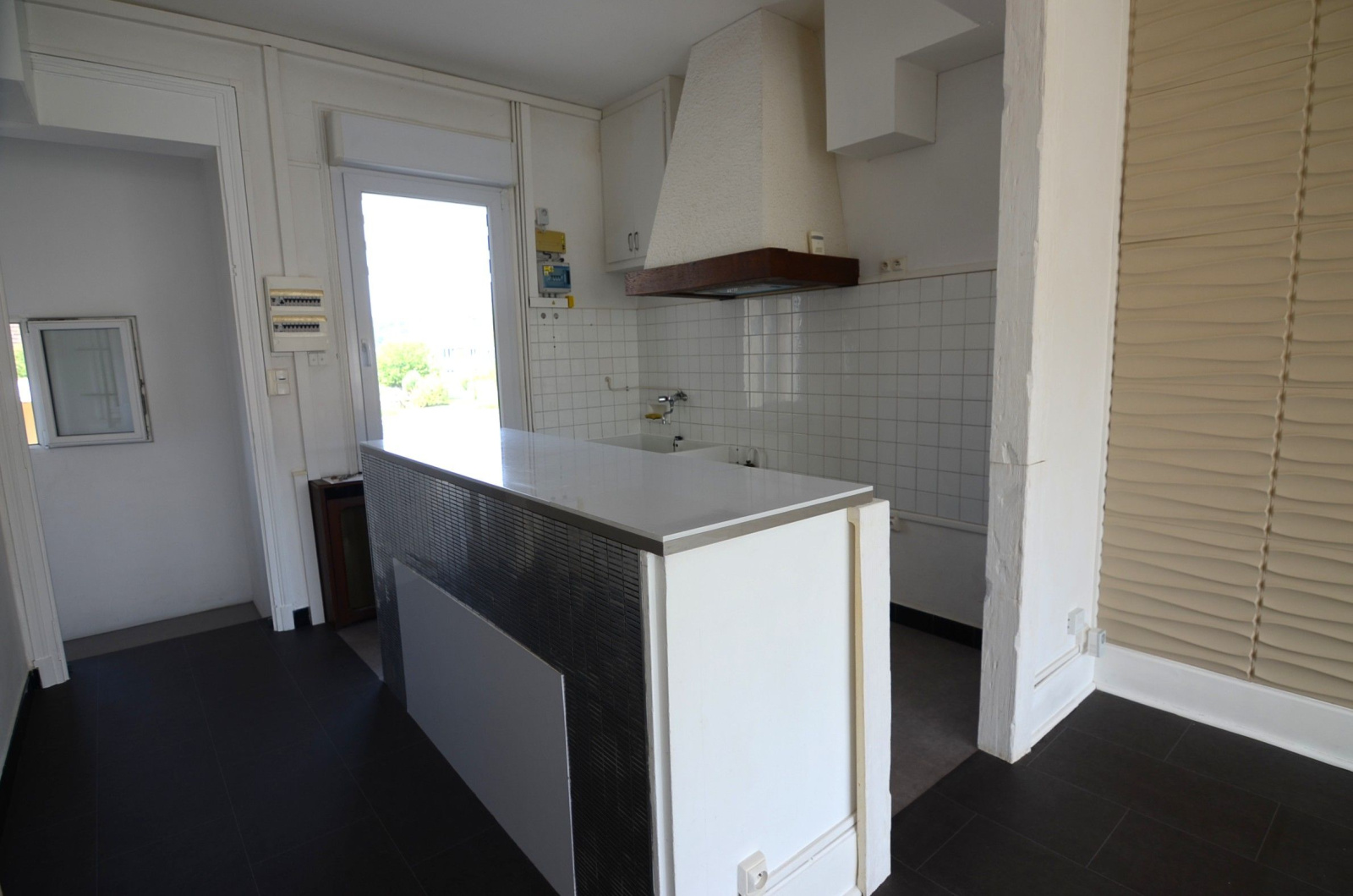 Au niveau principal : hall d'entrée, pièce à vivre avec baie vitrée ouverte sur la cuisine et son îlot central, chambre avec dressing et wc.