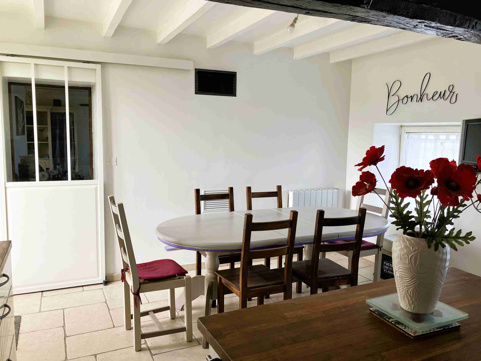 Au rez-de-chaussée : hall d'entrée/dégagement avec poêle à granulés, cuisine équipée, séjour avec poêle à bois, bureau, salle d'eau avec wc et wc séparés.